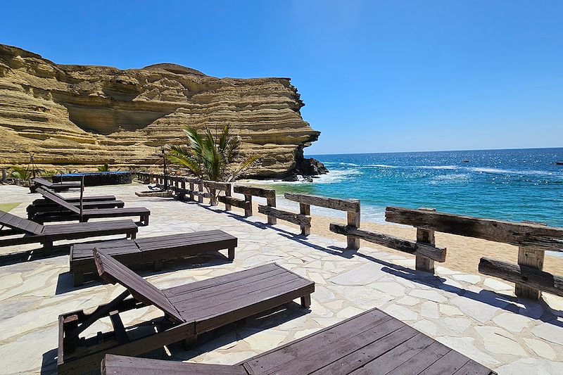 Entre désert et océan, à une trentaine de km de la ville de Namibe, nous vous emmenons dans un lieu idyllique et intimiste pour vous détendre dans ce petit coin de paradis, niché entre deux falaises, les yeux dans les vagues…