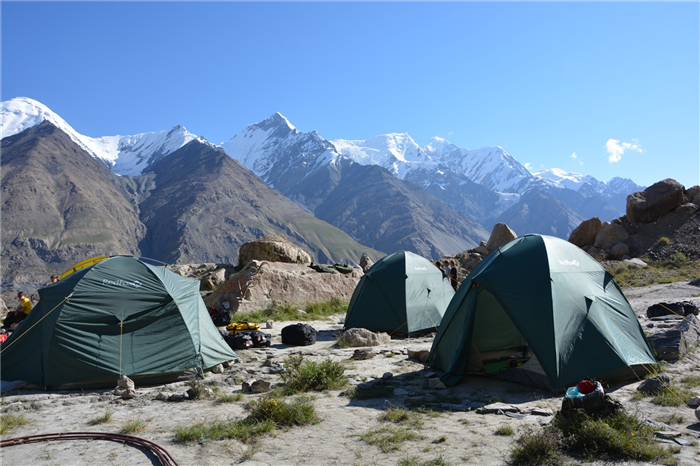 Tôt le matin, départ pour le camp de base 1 du pic Lénine, perché à 4 400 m d’altitude. Le sentier commence par une descente dans la gorge, puis traverse la rivière Achyk-Tash sur un petit pont, avant de remonter vers le vaste haut-plateau d’Ashyk-Tash. En chemin, vous croiserez plusieurs camps d’alpinistes, témoins de l’effervescence des expéditions sur le pic Lénine. L’itinéraire se dirige ensuite vers le col des Voyageurs, à 4 150 m, offrant un panorama à couper le souffle sur les sommets et glaciers environnants. Vous rencontrerez également les chevaux de bât, transportant le matériel nécessaire aux camps en altitude. Enfin, vous atteindrez le camp de base 1, où vous vous installerez pour vous reposer et vous acclimater avant les étapes suivantes.