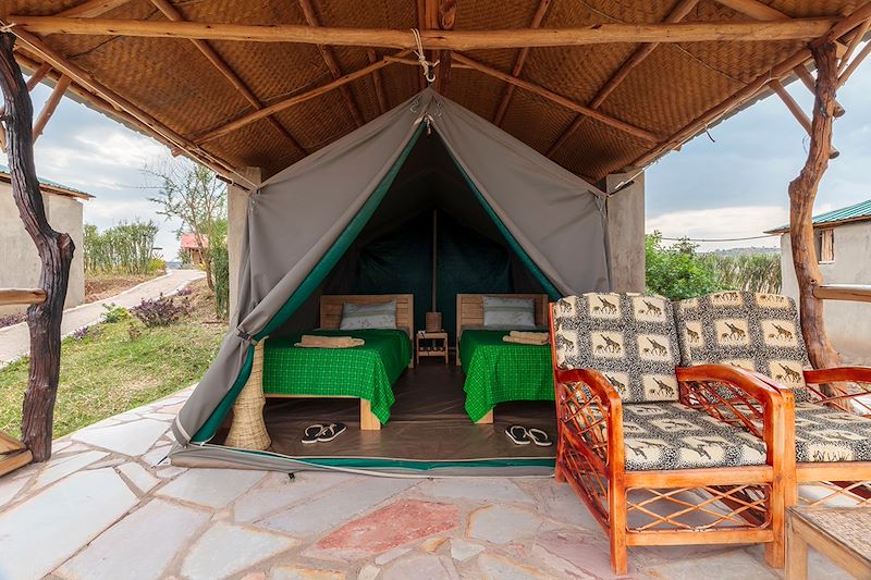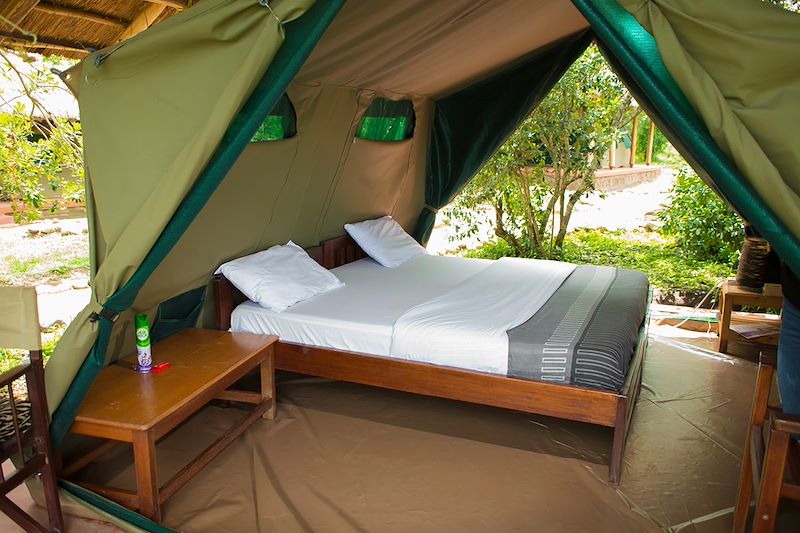Petit-déjeuner au lodge et départ pour votre seconde journée de safari dans le parc national Queen Elizabeth, cette fois vers la section nord. Il s'étend sur 1978 km² et offre une grande variété de paysages, entre savane, prairies, forêts clairsemées, zones humides et lacs, dont le célèbre lac Edward. Matinée complète de safari avec votre 4x4, aux heures où la faune est la plus active. Dans le parc, 4 des Big 5 sont présents, à l'exception des rhinocéros, qui a malheureusement disparu dans les années 70 en raison du braconnage intensif. Il est néanmoins possible de les observer dans le sanctuaire de Ziwa, qui peut faire l'objet d'une étape supplémentaire. L'après-midi, découverte en bateau du canal de Kazinga, qui relie les lac Edward et le lac George. Ce bras d'eau de 32 km s’aventure à travers plaines inondées et rives grouillantes de vie sauvage, et offre l’opportunité d’approcher de près hippopotames, crocodiles, éléphants et buffles, tout en surprenant une multitude d’oiseaux aquatiques, cigognes, hérons et cormorans. Installation au lodge en fin de journée, dans votre tente de safari simple mais accueillante ! Pensée pour offrir une immersion authentique au cœur de la brousse, chaque tente dispose de lits douillets, d’une table de chevet et d’une prise électrique, le tout sous une toiture en chaume avec une petite terrasse privée où profiter de l’ombre et de la tranquillité environnante. Le tout à quelques minutes à pied des installations principales et communes du lodge.